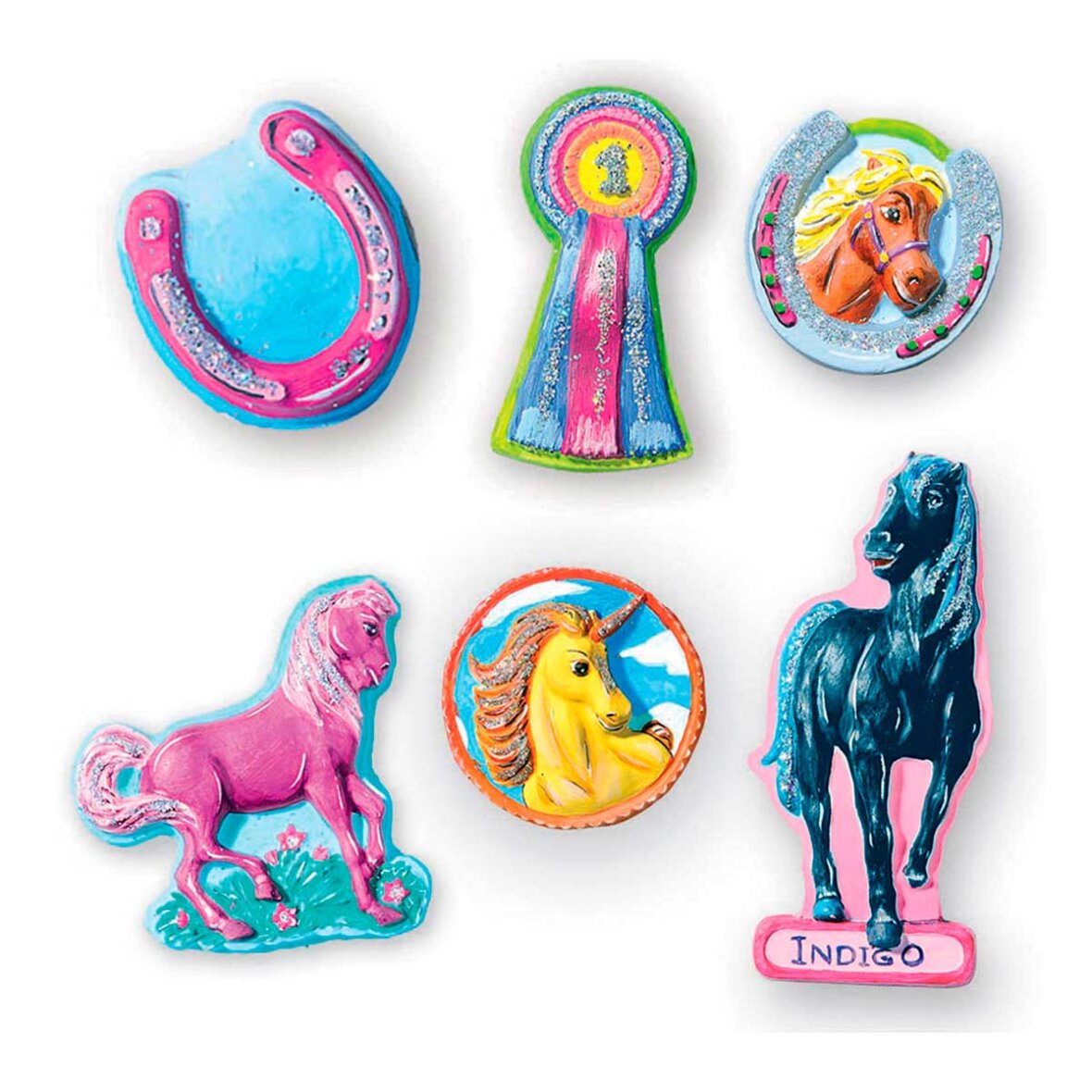 Støb heste og hesteudstyr i gips og dekorer dem derefter i de fineste farver, og afslut med glitter. Sættet indeholder alt, hvad der skal bruges.