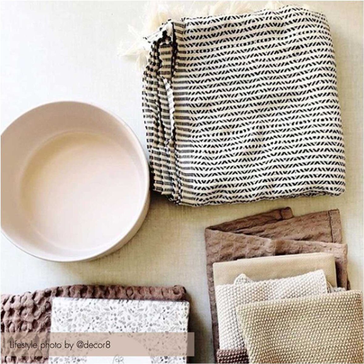 Håndklæderne har frynser i enderne og er vævet med en naturhvid grundtråd.
