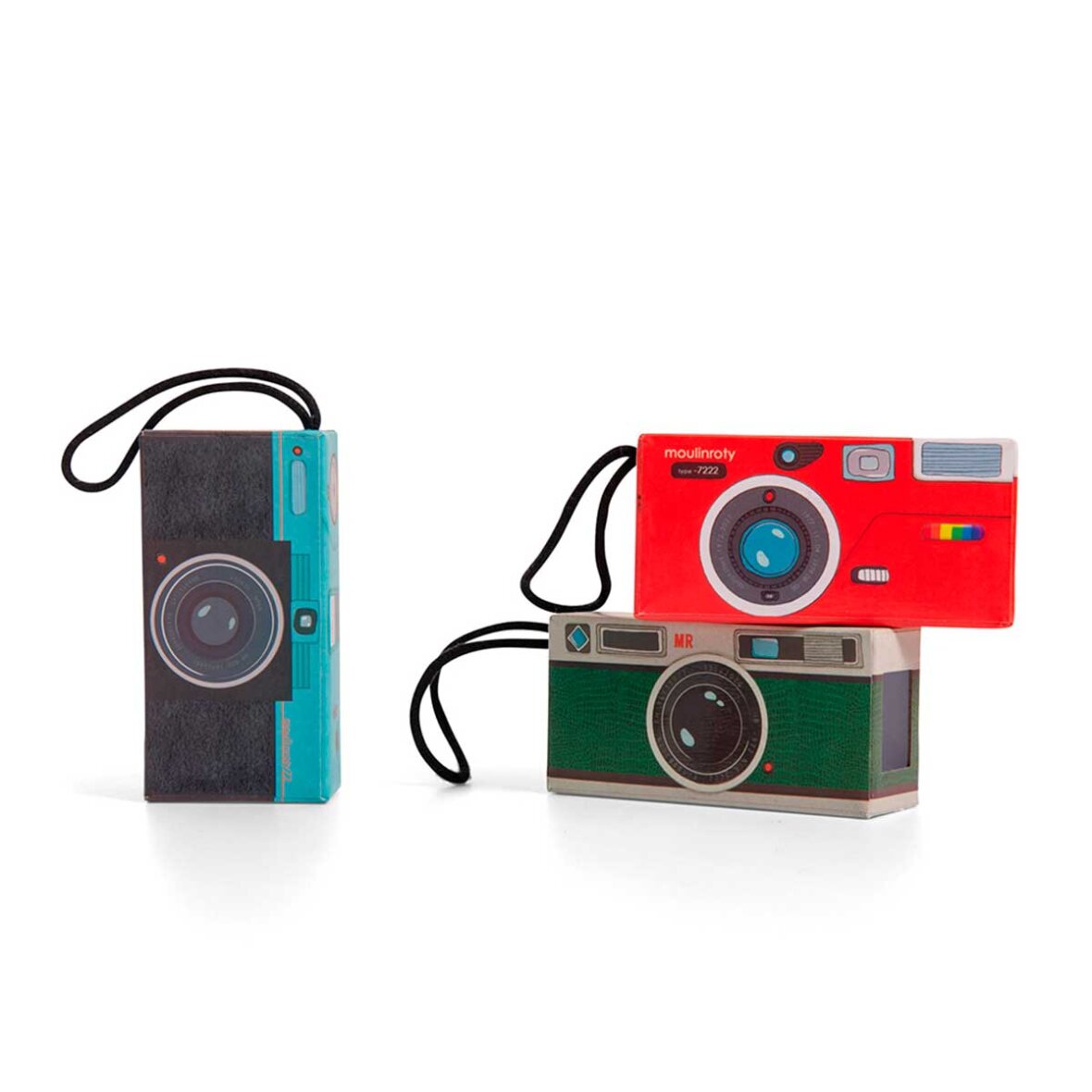 Spionkamera fra Moulin Roty. Dette er ikke et helt almindeligt kamera, men et spionkamera med hemmeligt udsyn til siderne. Kameraet kommer i tre forskellige farver, rød, grøn og blå.