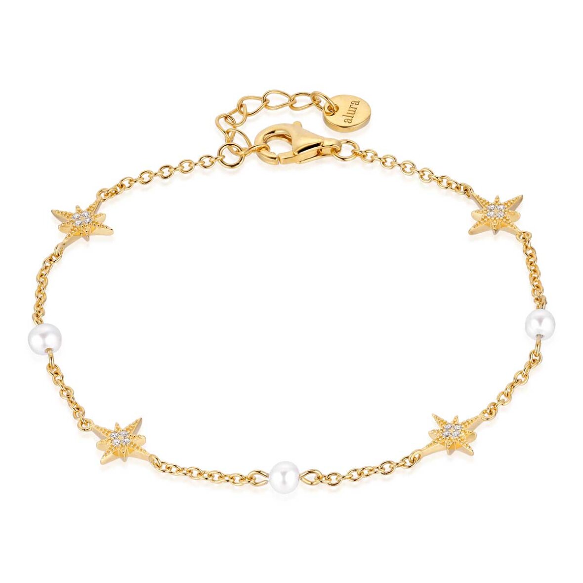Det yndigste armbånd med hele 4 smukke 8-takkede stjerner, hver med 4 funklende zirkonia, der symboliserer de fire verdenshjørner. Derimellem 3 ægte ferskvandsperler.