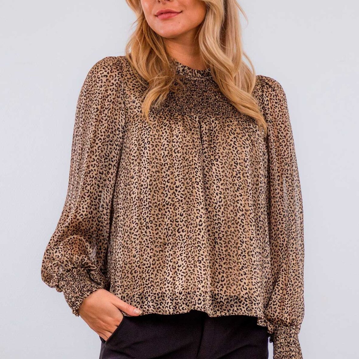 Feminin bluse med smock detaljer på brystet og på ærmerne. Den kommer i et fint simpelt leo print.