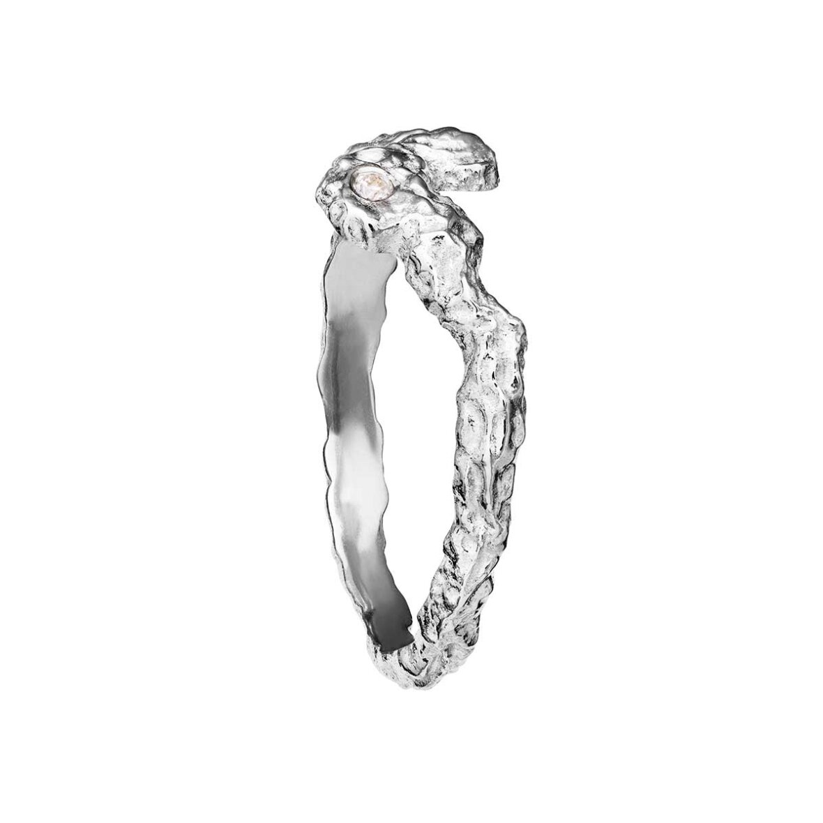 Frida ring fra Maanesten. Denne smukke Frida ring er en hyldest til naturens tilfældige og foranderlige skønhed. Ringens organisk formsprog og rå overflade komplimenteres af funklende lyse zirkoner, der giver illusionen af sand, der glimter under solens varme stråler.