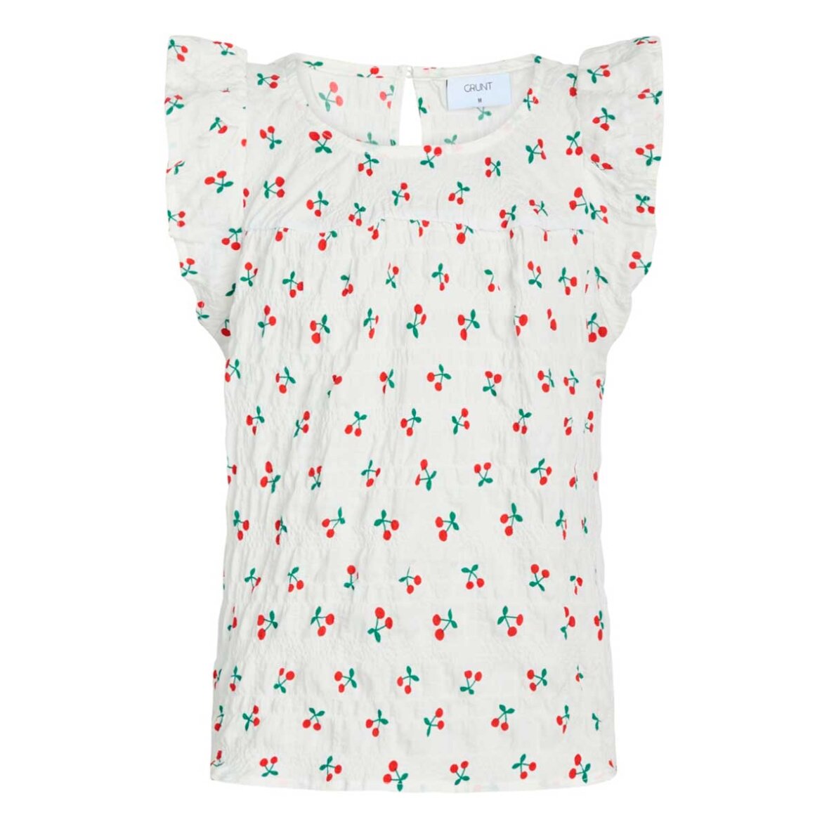 Tipi top fra Grunt. Dette er en super sød og flot top, denne top er pyntet super smukt med en masse lækre kirsebær. Ærmerne på denne fine top er pyntet super fint med en lille flæse. Toppen lukkes i nakken med en enkelt knap, og du kan bruge denne top med den matchende nederdel.