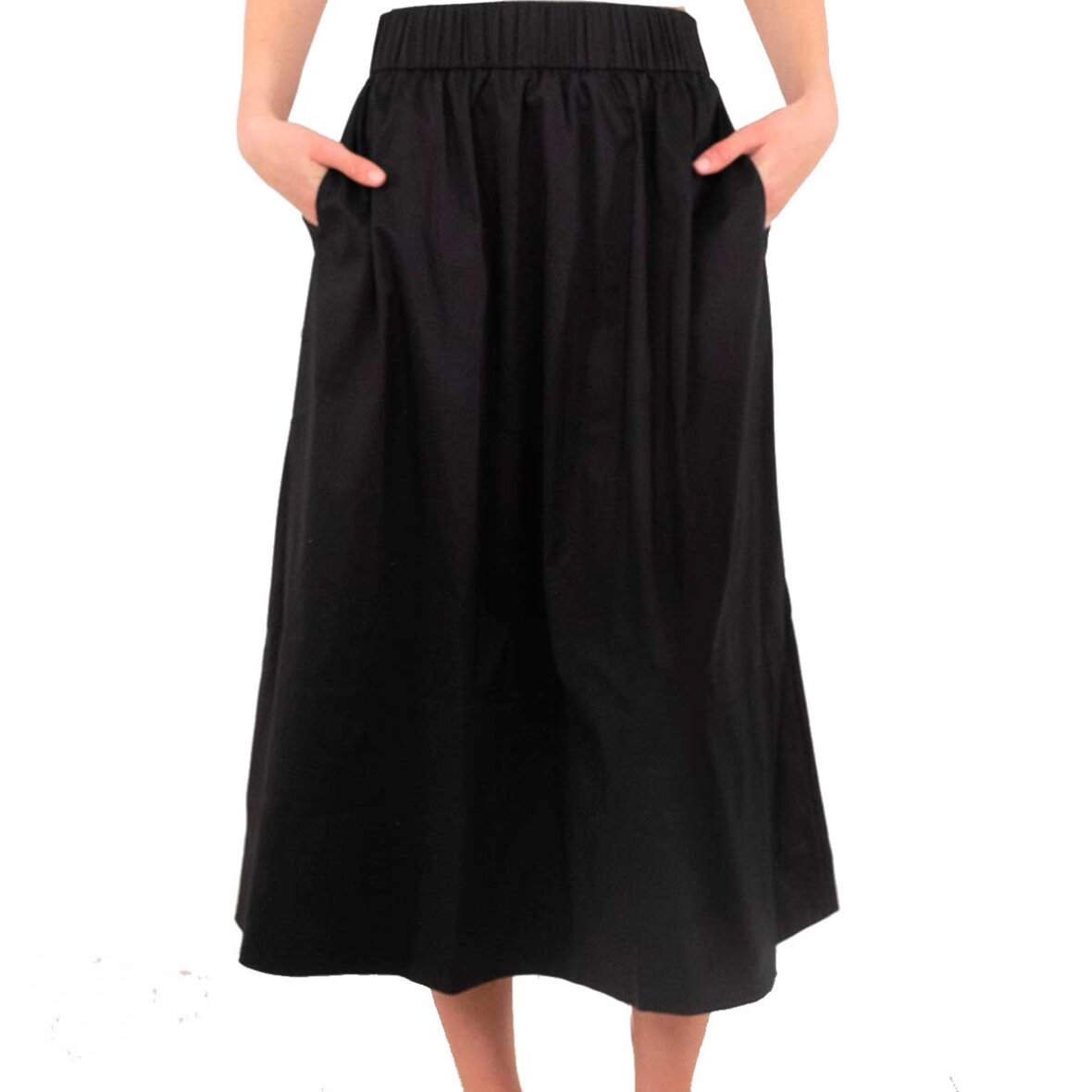 En midi-nederdel i let og struktureret poplin, der kombinerer komfort med klassisk stil. Nederdelen har bred elastik i taljen, diskrete sidelommer og et let vidde skørt, som skaber et feminint og bevægeligt look.