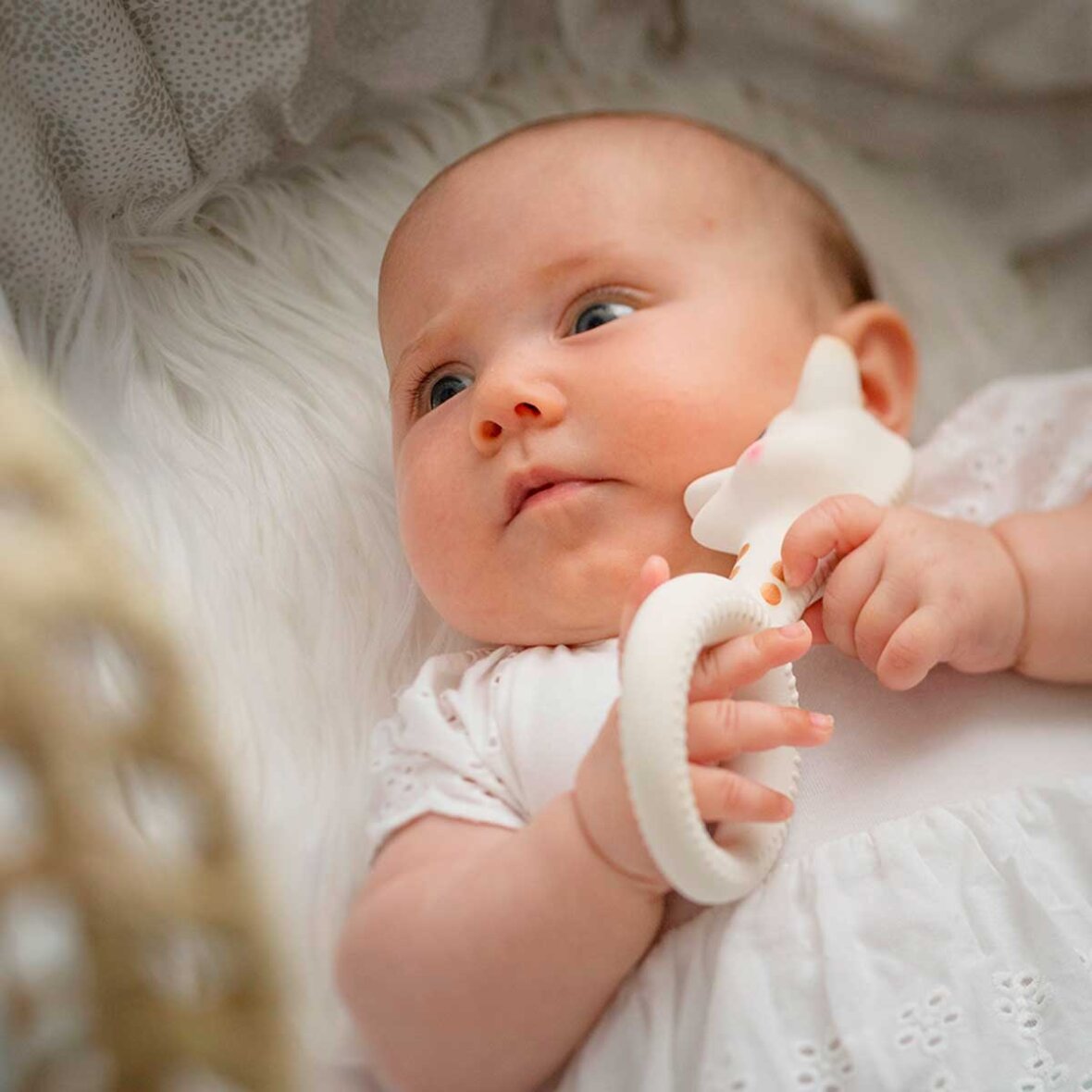 So pure bidering fra Sophie la Girafe. Overdelen er med det velkendte ansigt af Sophie la Girafe og med stor ring som gør det let at holde fast i giraffen, og ekstra god at bide i takket være de særlige riller og prikker som nænsomt massere gummerne. Blid og behagelig at tygge på. Let at gribe fat i og holde fast på for små fingre.