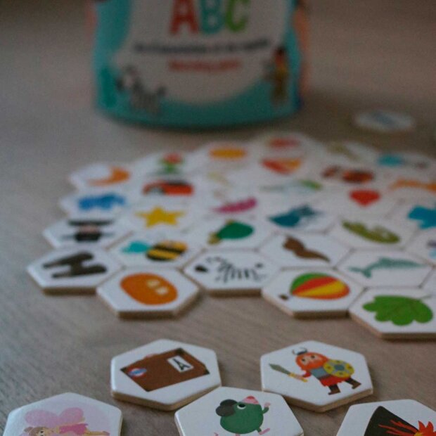 Lær dit barn ABC ved at sætte ord på brikkernes motiver via matchende brikker med motivernes forbogstaver.
