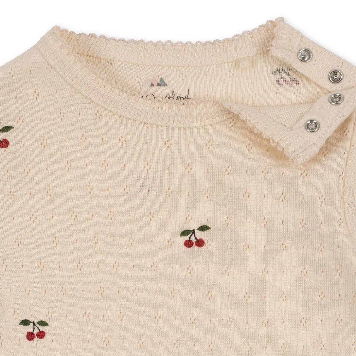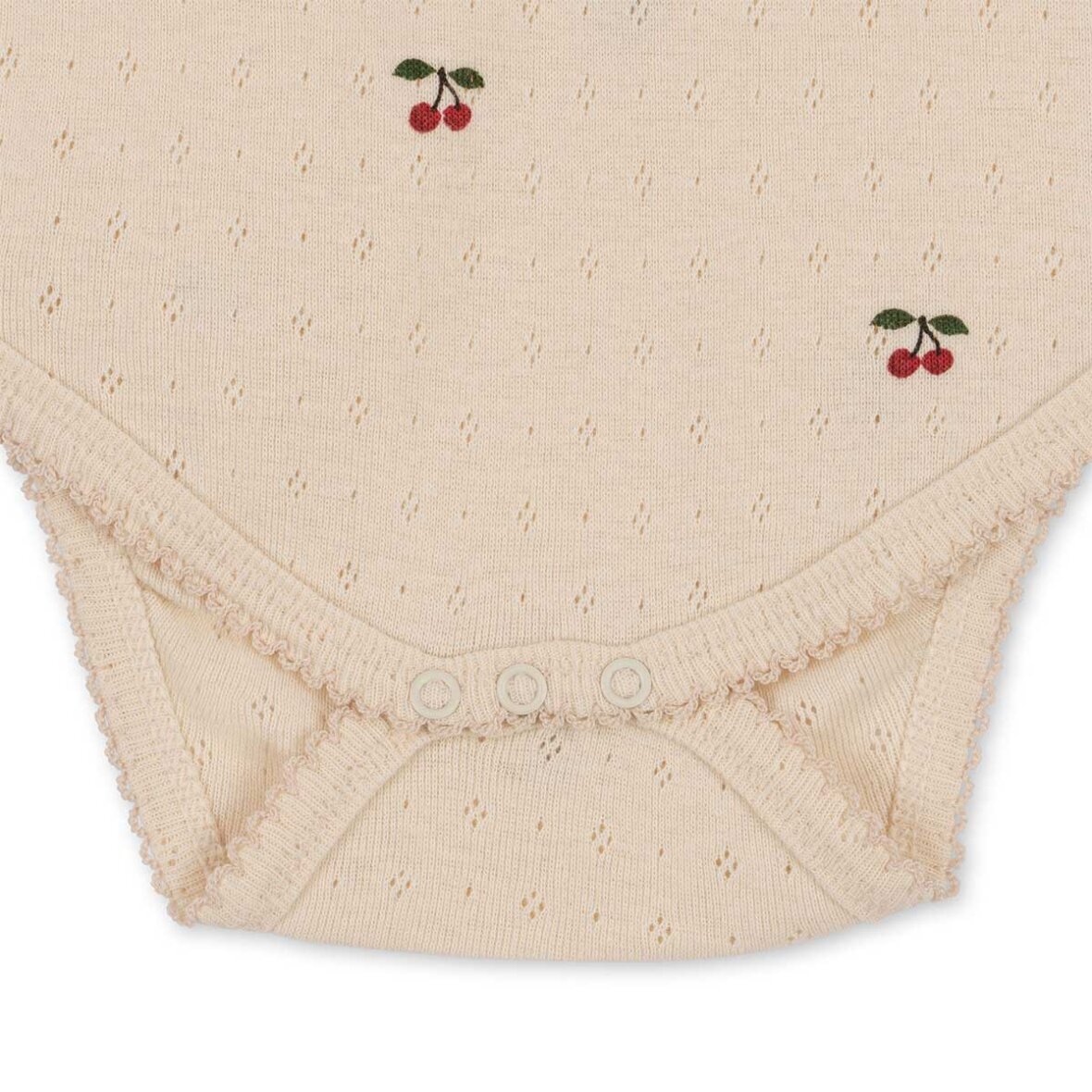 Minnie bodystocking fra Konges Sløjd. Her får du en blød body fremstillet i økologisk hulstrikket bomuld, med musetakkede kanter. Denne body er designet med praktisk kuverthals og trykknapper mellem benene.