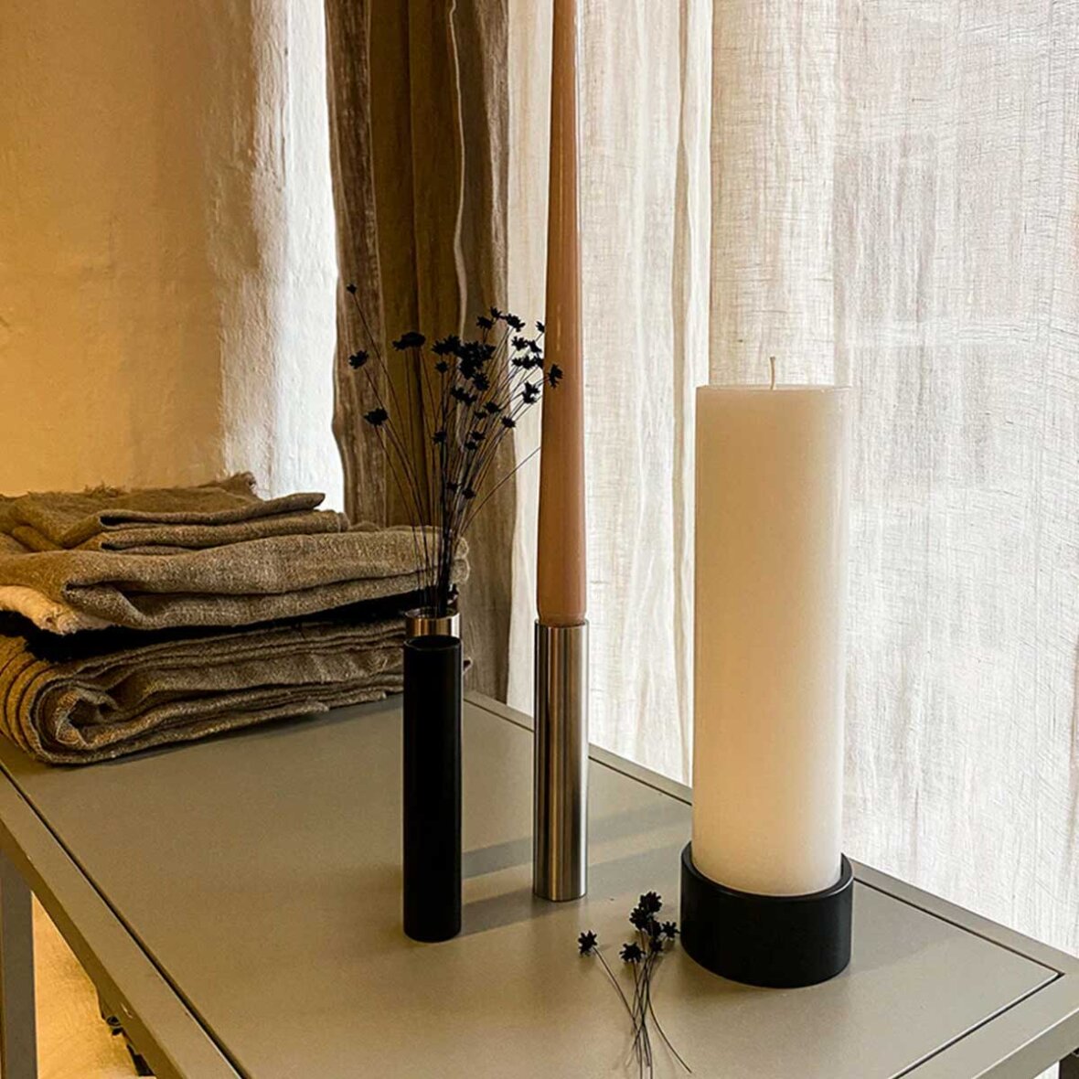 Fat light fra Hove Home. Fat Light, fuldender den æstetiske lysestagesamling. Fat Light er en lysestage til søjlelys. Fat Light udtrykker elegance og luksus gennem det minimalistiske design og de tunge materialer. Der er en dragende skønhed i det skrøbelige udtryk - også når illusionen brister, og løfter lysestagen op.