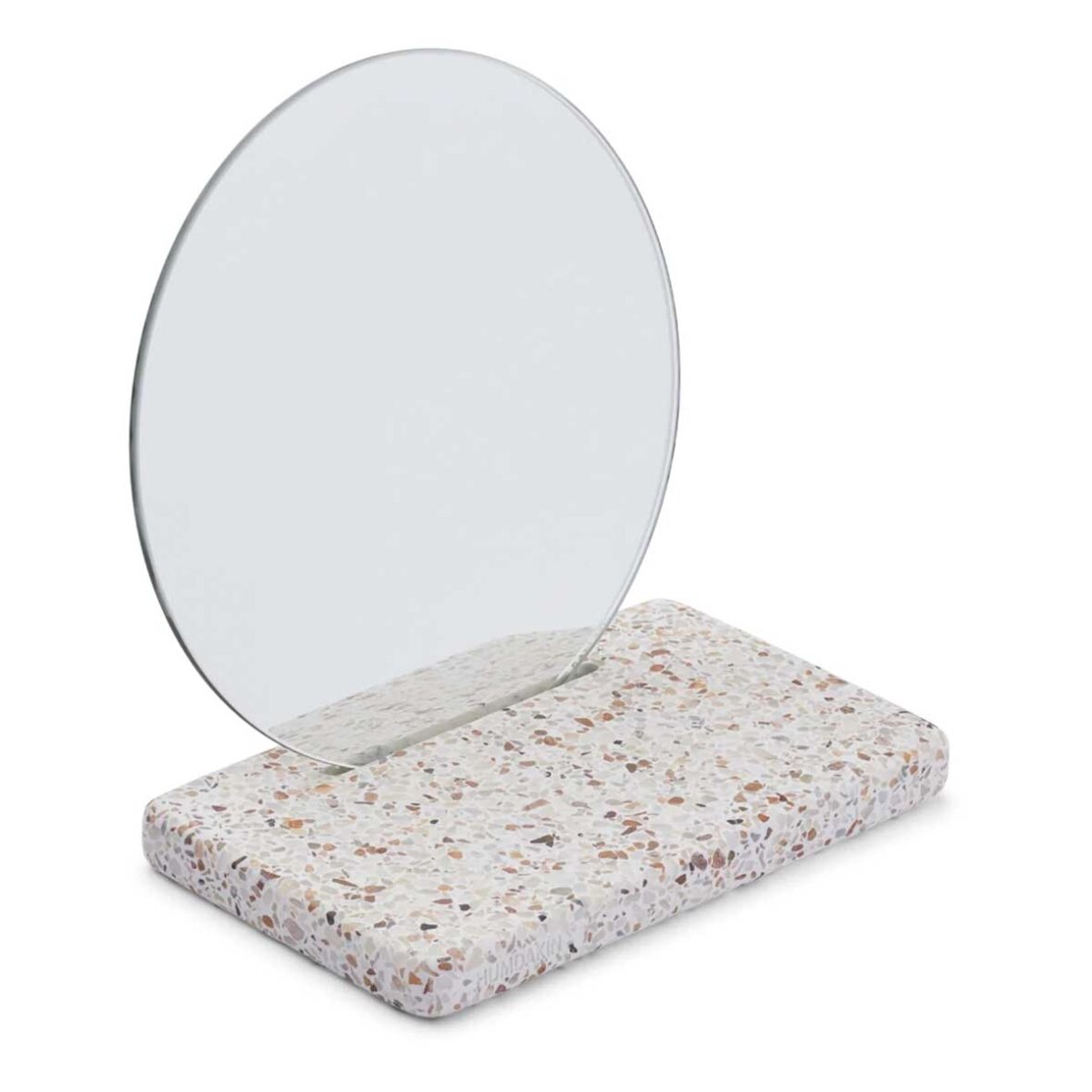 Terrazzo spejl fra Humdakin. Et makeup-spejl ud over det sædvanlige. Brug det til at style dit badeværelse med et smukt spejl. Foden gør det muligt at placere dine yndlingsprodukter lige foran dig til din daglige plejerutine.