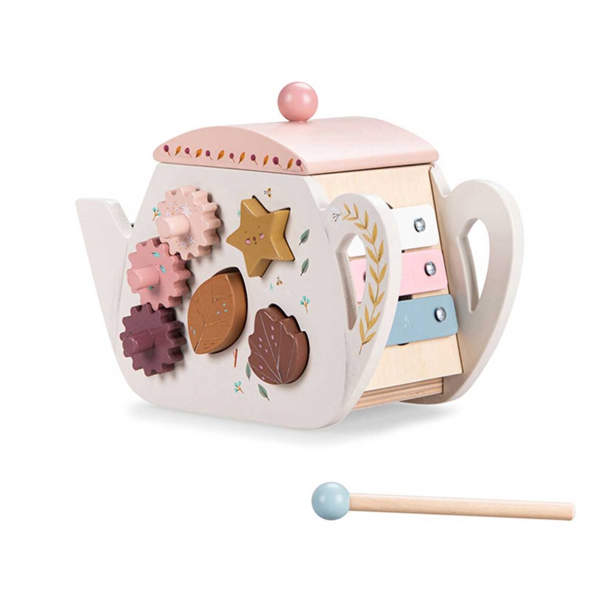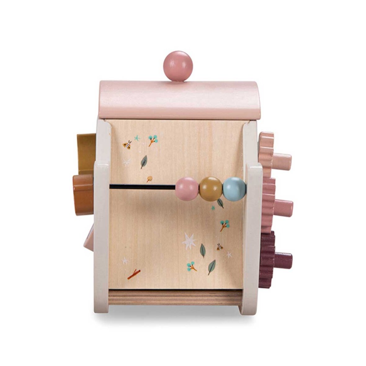 Hver af de 4 sider har sjove aktiviteter at udforske: En kuglerramme, puttekasse, tandhjul til at dreje og en xylofon.