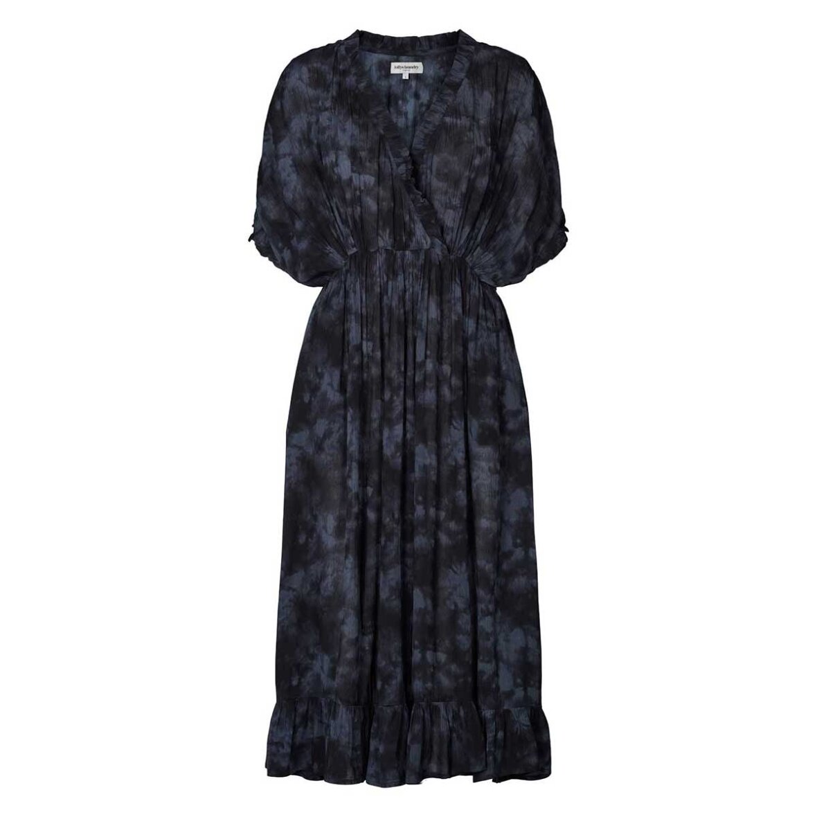 Idina kjole fra Lollys Laundry. Denne kjole har en normal pasform og en fin V-halsudskæring med crossover detalje. Den har korte, løse ærmer, som giver den et blødt look. Der er frill ved halsudskæringen og ærmerne.