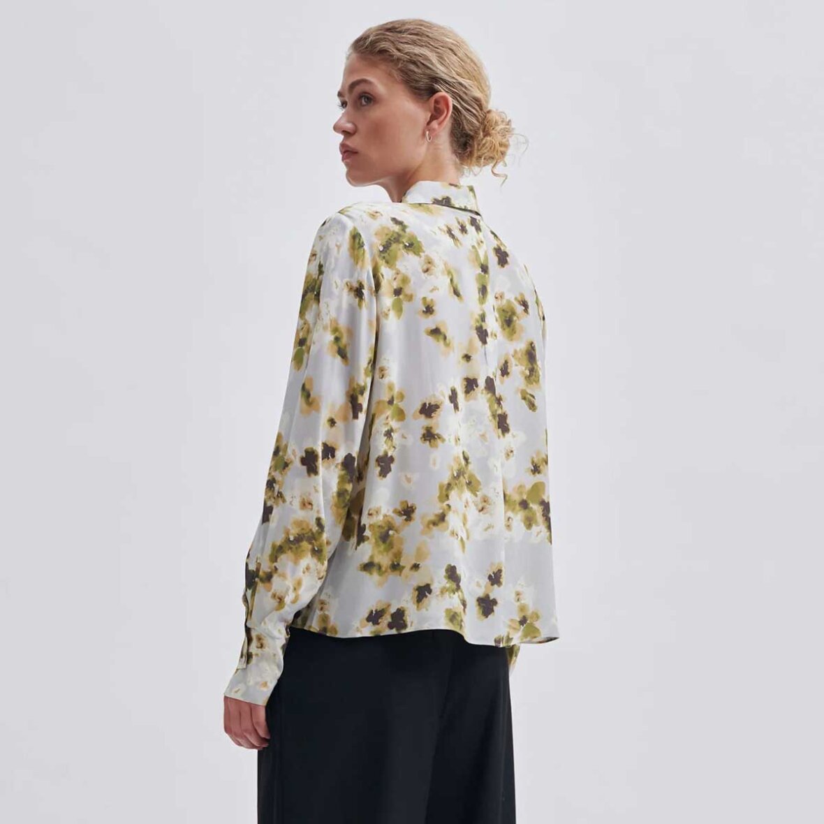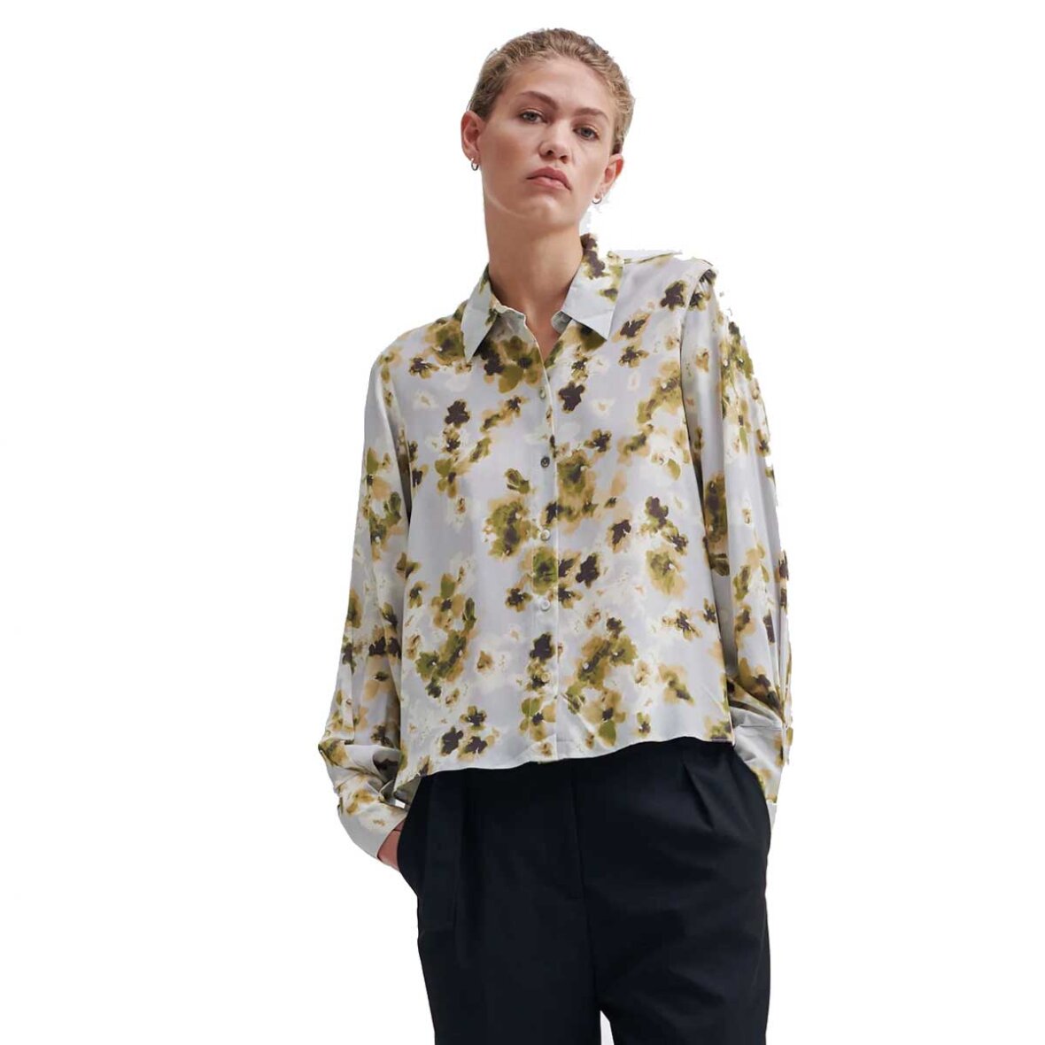Andra skjorte fra Second Female. Denne skjorte er fremstillet i glat viskose i en blød, draperende kvalitet med blomsterprint. Skjorten har en normal krave og gennemgående knaplukning med betrukne knapper. Lange ærmer og brede, asymmetriske manchetter med knaplukning. To brystlommer med flapper. Lægdetalje ved sømmen bagpå. Skjorten har en løs, luftig pasform.