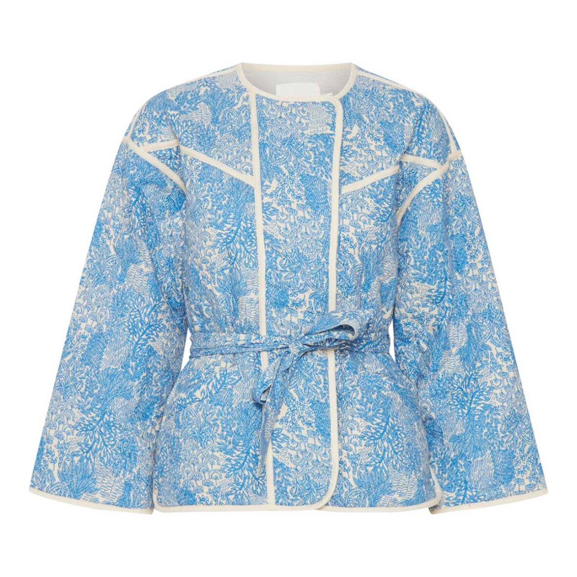 Floria jakke fra Atelier Reve. Her får du en flot jakke, som kommer i et smukt mønster. Denne jakke er med lange ærmer, en rund halsudskæring og jakken lukkes med et bindebånd i taljen.