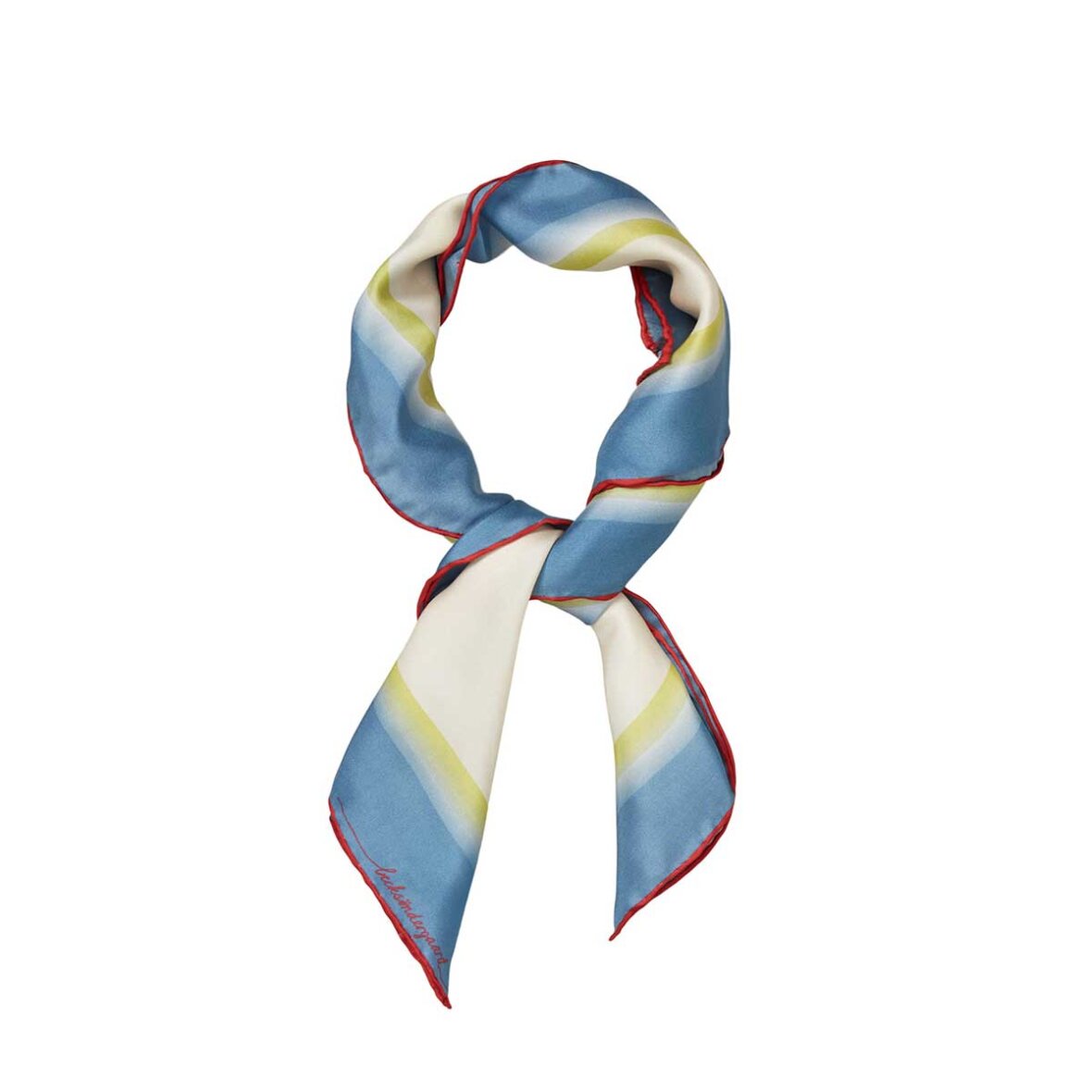 Blanco Sia tørklæde fra Beck Søndergaard. Her får du det perfekte sommertørklæde. Dette tørklæde er fremstillet i silke, og er med en enkel hvid og blålig kant.