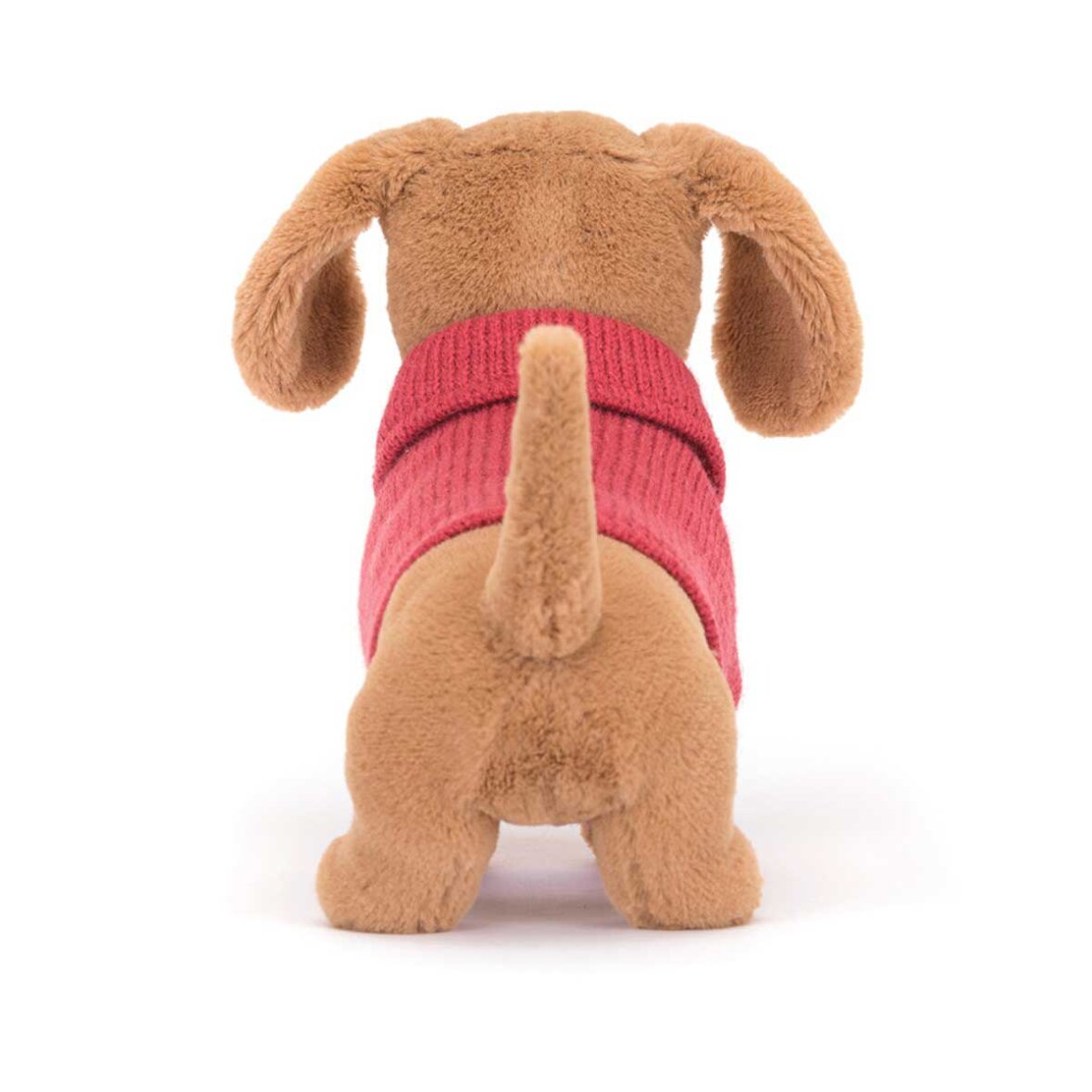 Skøn lille gravhund fra Jellycat med en flot varm pink sweater.