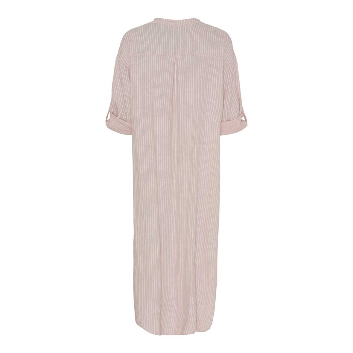 Farven er en lys rosa med hvid stribeeffekt – et mildt, varmt og behageligt farvespil, der giver kjolen et blødt og feminint udtryk.