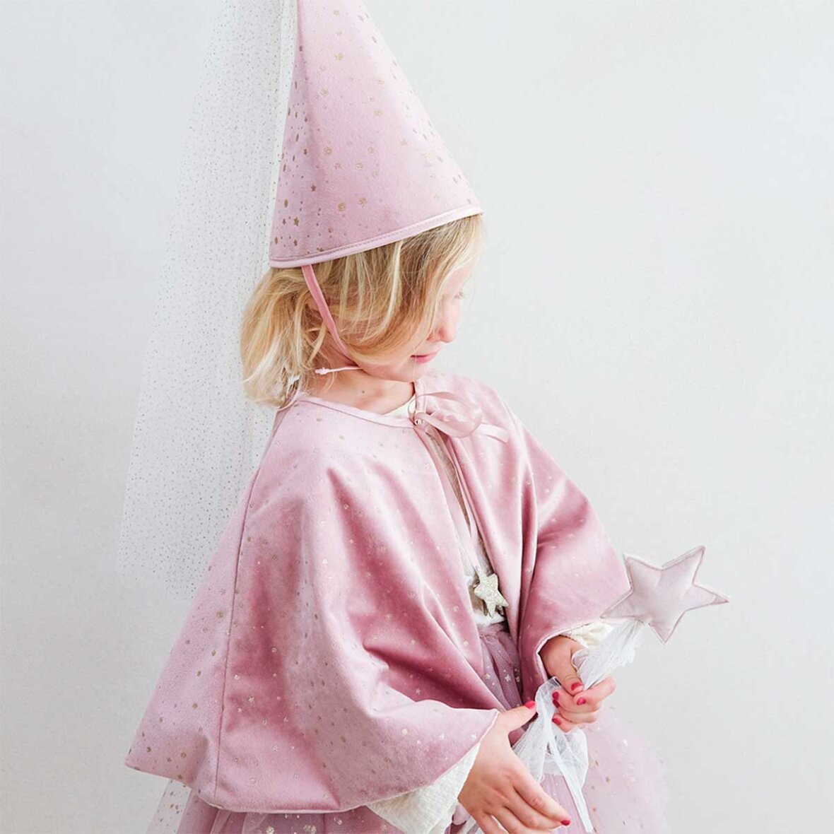 Spred stjernestøv med denne fine tryllestav, hvor den polstrede stjerne på toppen er dekoreret med måne og stjerner med guldglimmer. 5 tylbånd er fastgjort til stjernen for en magisk, flagrende effekt. Stjernen er placeret sikkert på en pind, betrukket med satinbånd