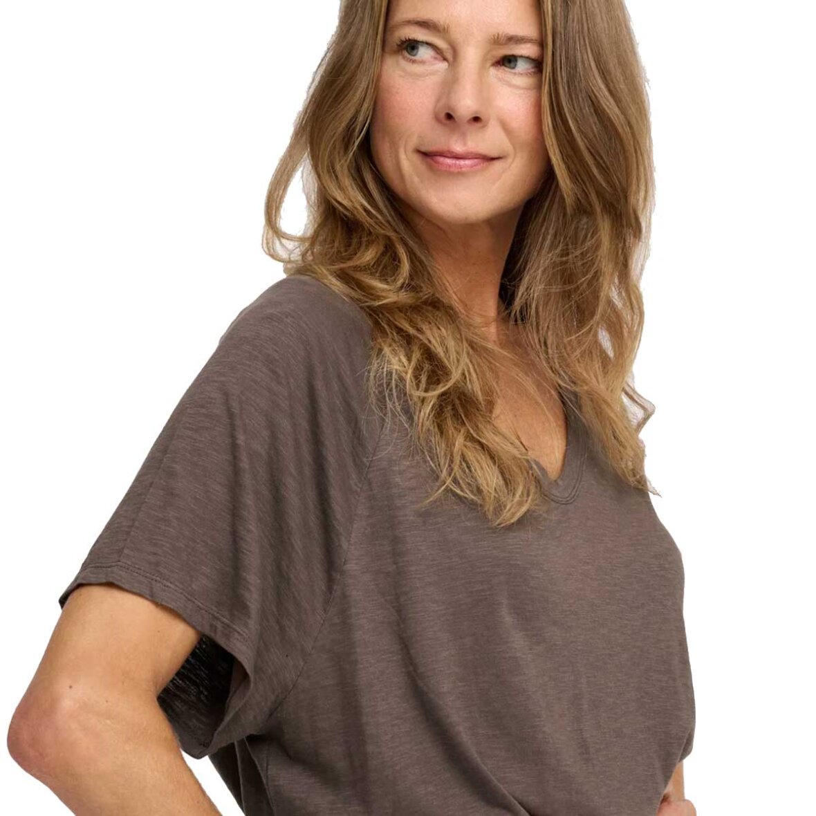 Brun knælang t-shirt-kjole med v-udskæring, korte ærmer og samme midi længde foran og bagtil.