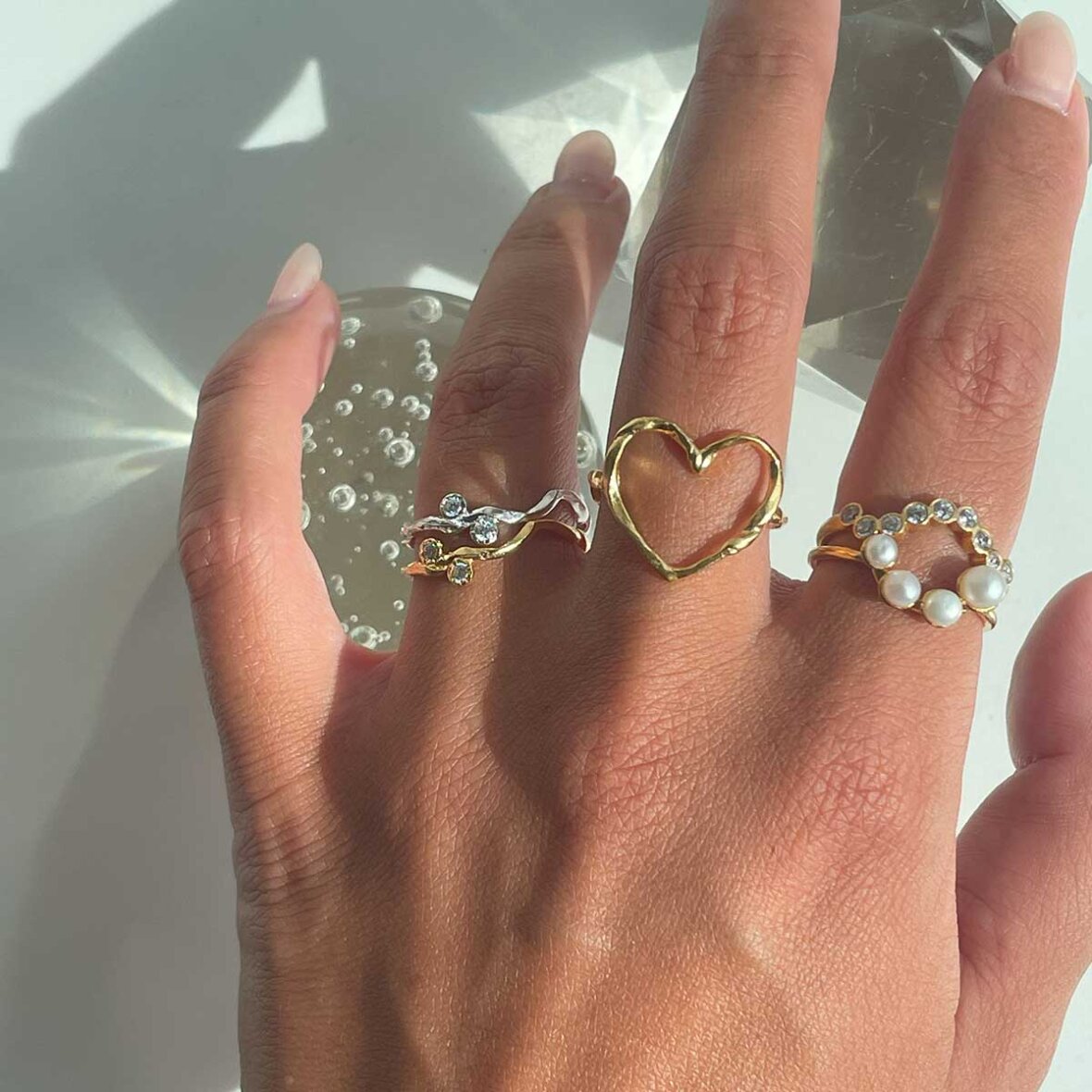 Beskrivelse: Åben hjerte-ring med snoet detaljer og let hamret overflade.
