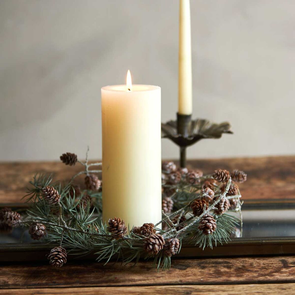 Her får du en smuk kogle guirlande som du kan bruge som pynt. Du kan f.eks. have den liggende på bordet, for at pynte smukt til din borddækning.