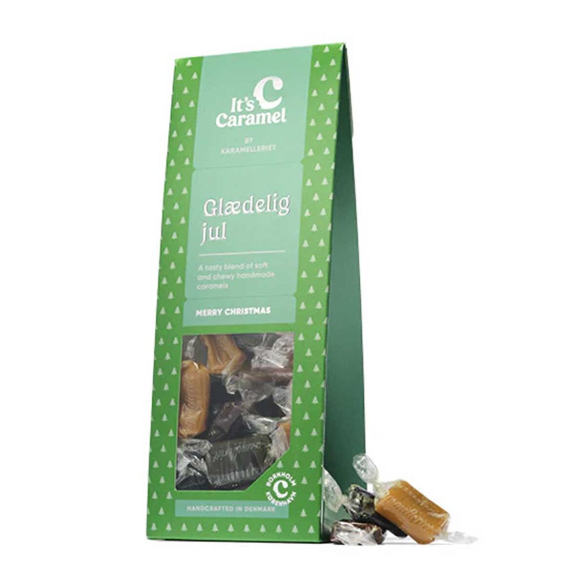 Æsken er i smukke grønne nuancer med sølveffekt og fine små juletræer. Den indeholder en blanding af Karamelleriets klassiske Flødekarameller - 180g i alt.