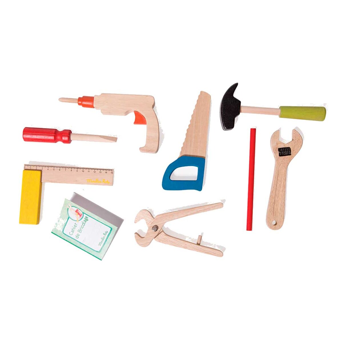 Indeholder værktøj i børnestørrelse lavet af træ: en lille sav, hammer, papegøje- og knivtang samt skruemaskine, skruetrækker, lineal og notesblok.