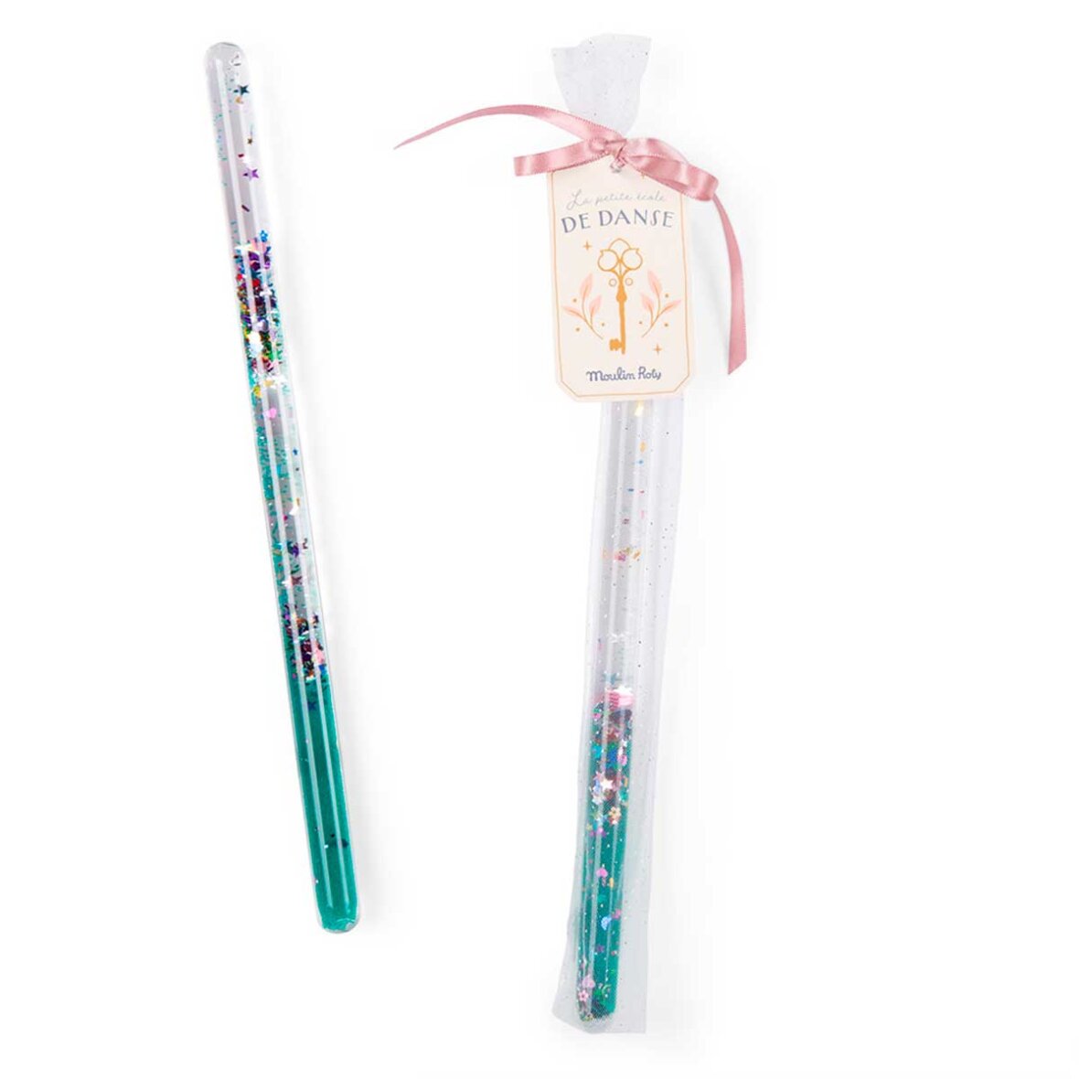Den gennemsigtige tryllestav er fyldt med en farvet og flydende gelé med og hjerte-, måne- og stjerneformet glimmer.